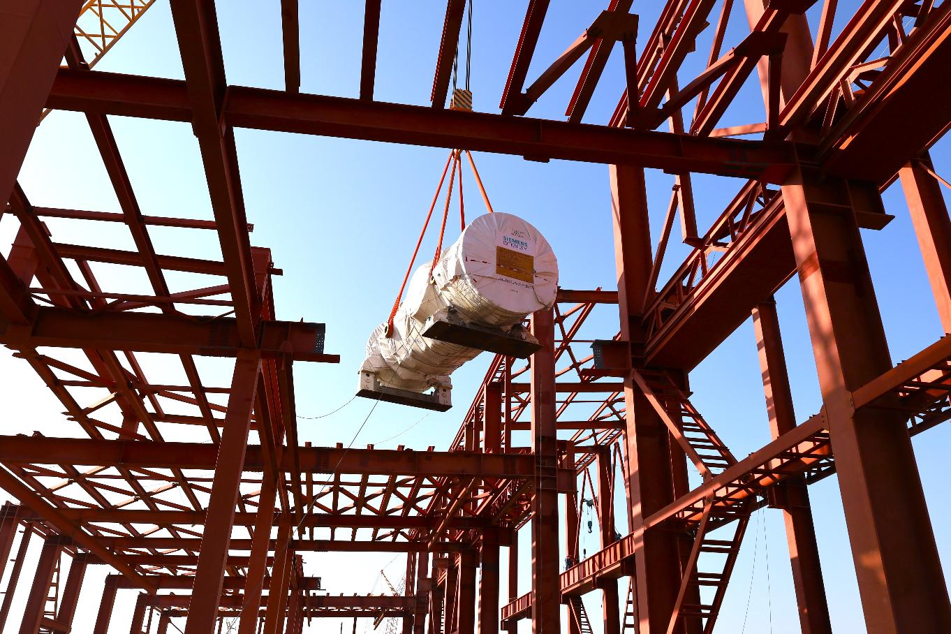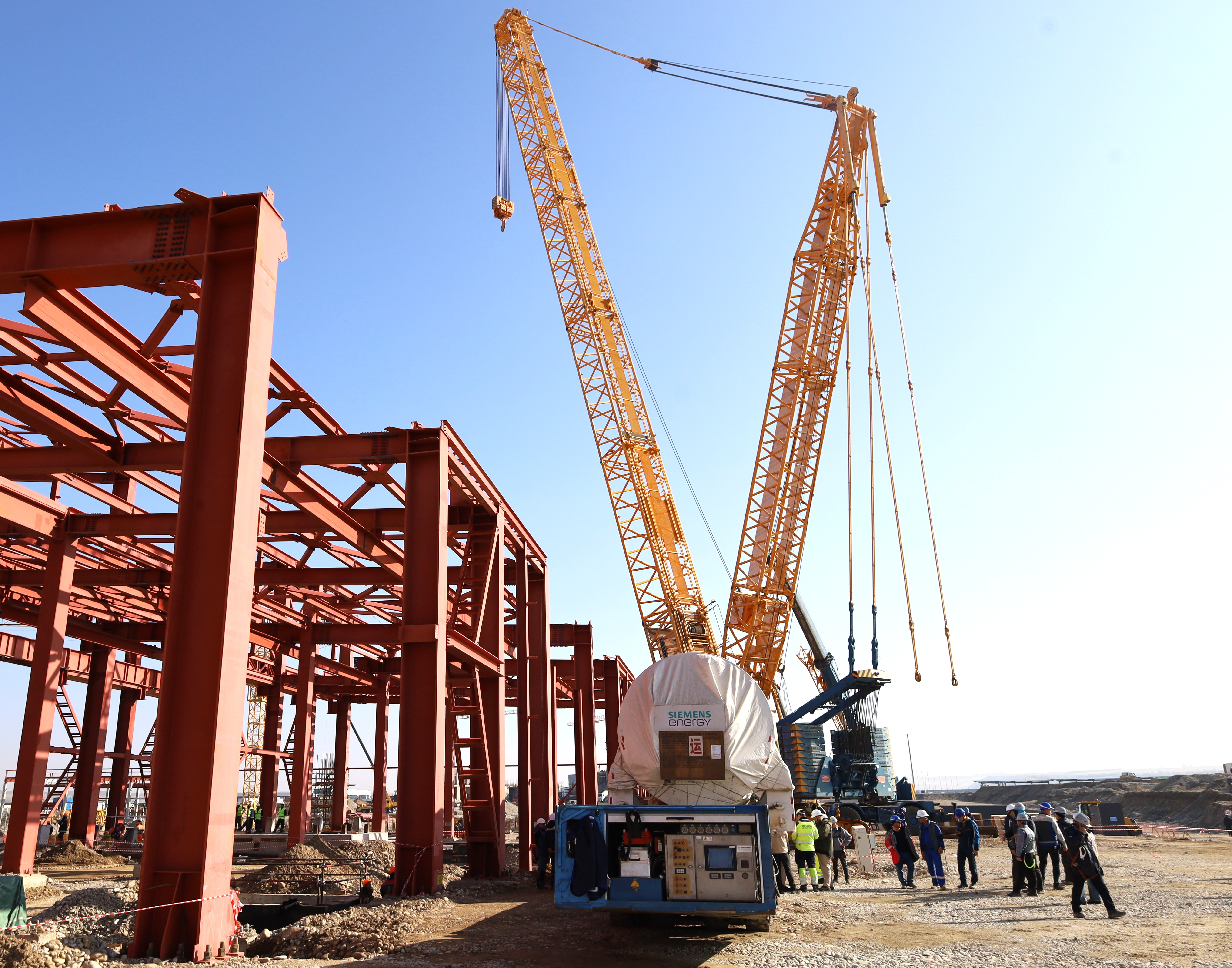 The first gas turbine has been installed in the main building of CCGT Turkistan with a capacity of 1000 MW at the construction site. The turbine weighs approximately 200 tons. The unit was transported using a 600-ton heavy-duty crane, one of the most powerful lifting machines currently operating in the Turkistan region.